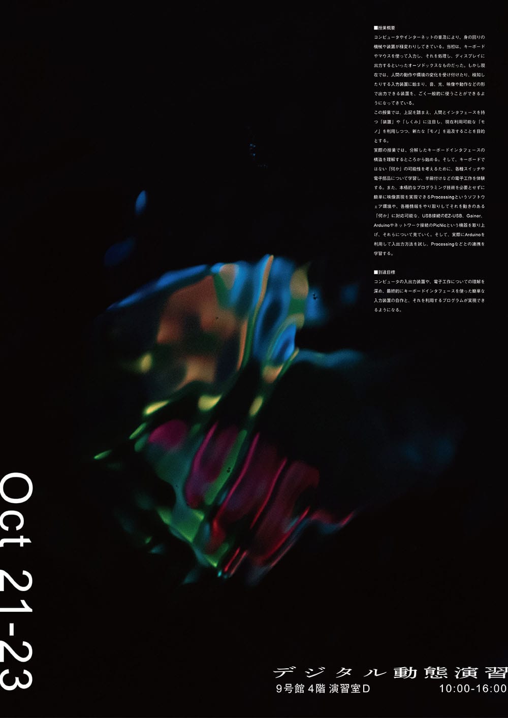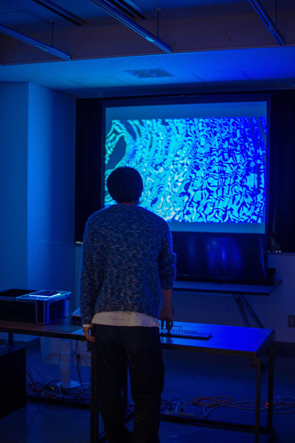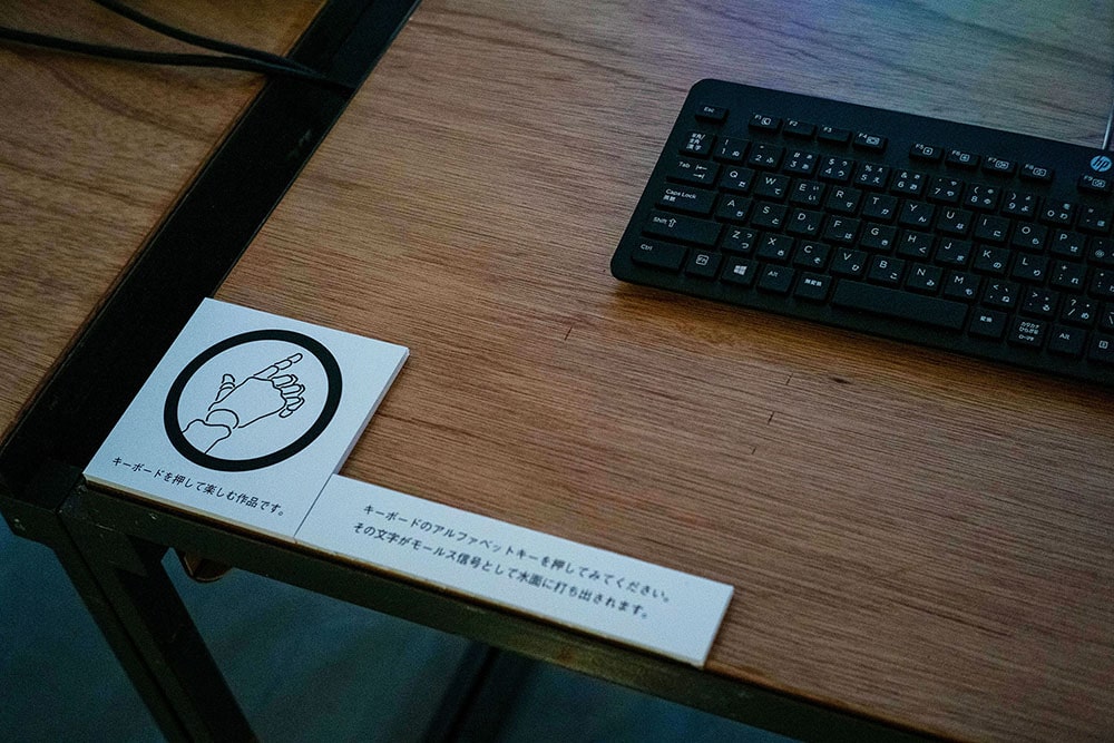 街並みが水たまりに反射し、風で揺らめく様子を眺めていて、それを再現したいと思い、制作をはじめた。モールス信号のリズムで打ち出される波で水面を揺らし、その水面に映るLEDの変化を写真として切り取る。キーボードで打ち込まれた文字が波紋となって広がり、壁に跳ね返ったり、次に打ち出される文字とぶつかったりしながらだんだん消えていく。ソレノイドの制御にprocessingとArduinoを使い、LEDの色変化はArduino、一眼レフをスクリーンに出力し、フレームレートを変更するためにp5.jsを使った。