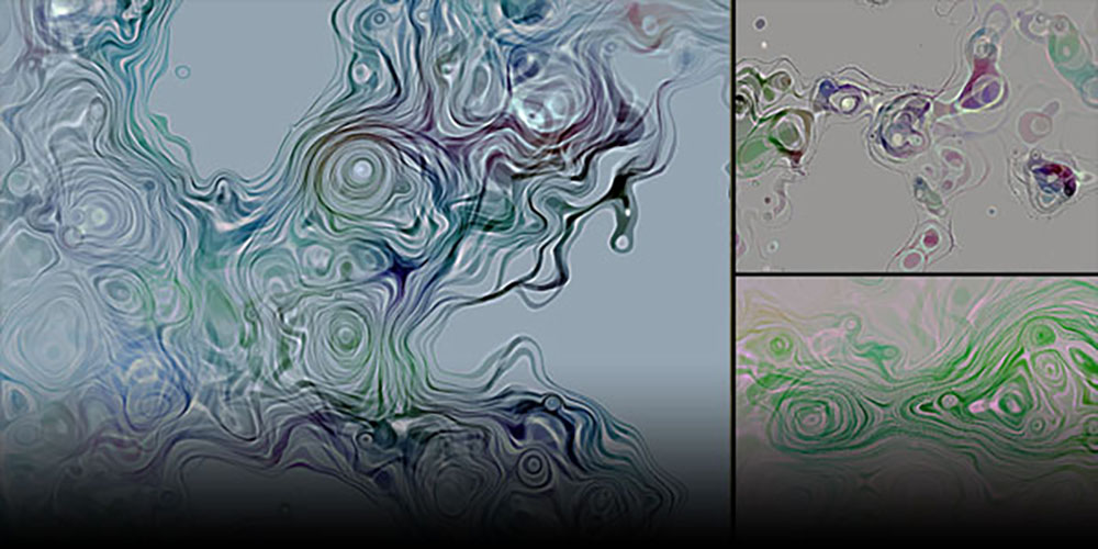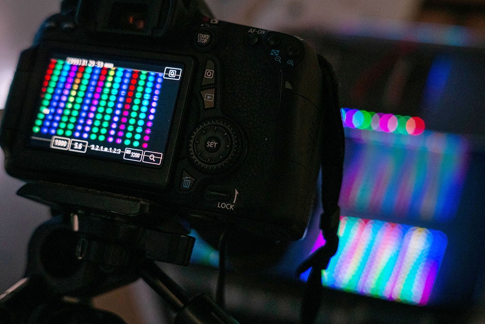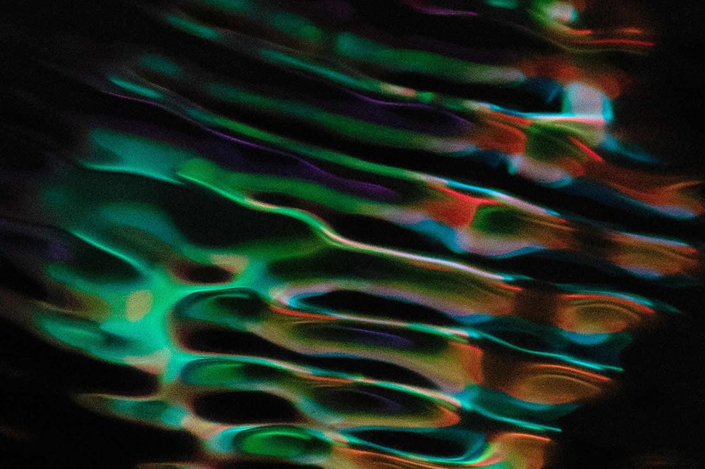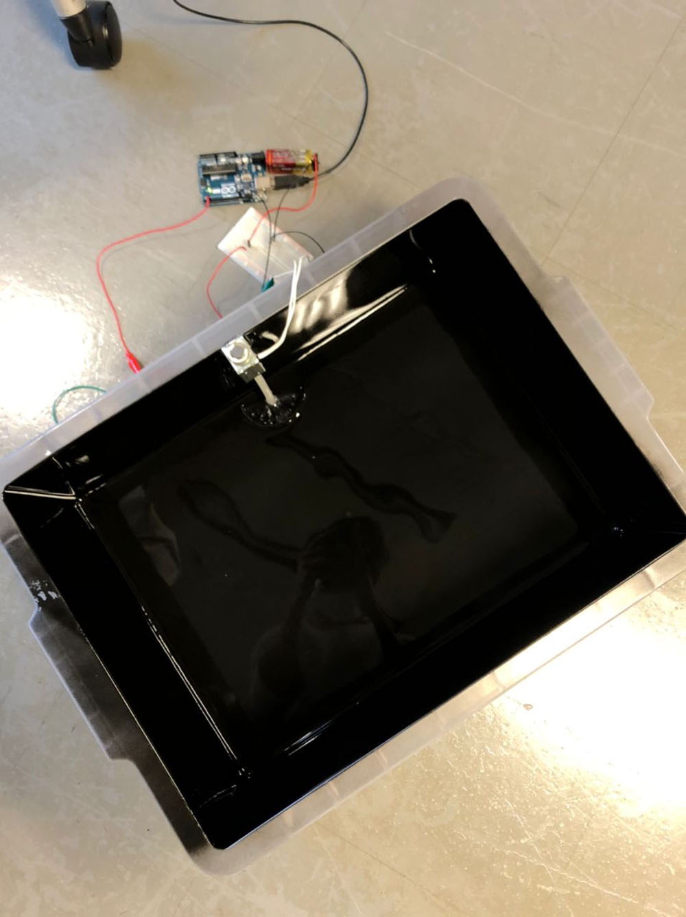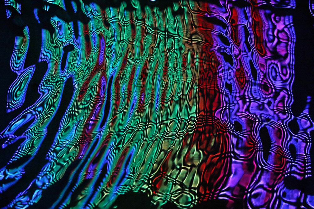 街並みが水たまりに反射し、風で揺らめく様子を眺めていて、それを再現したいと思い、制作をはじめた。モールス信号のリズムで打ち出される波で水面を揺らし、その水面に映るLEDの変化を写真として切り取る。キーボードで打ち込まれた文字が波紋となって広がり、壁に跳ね返ったり、次に打ち出される文字とぶつかったりしながらだんだん消えていく。ソレノイドの制御にprocessingとArduinoを使い、LEDの色変化はArduino、一眼レフをスクリーンに出力し、フレームレートを変更するためにp5.jsを使った。