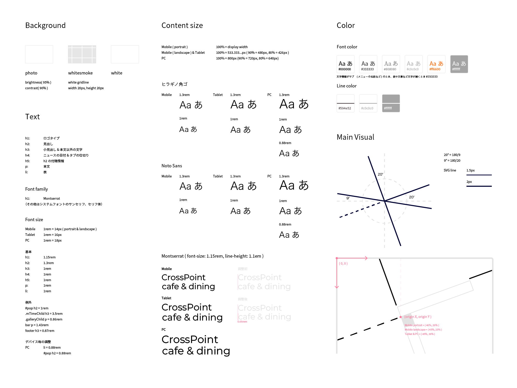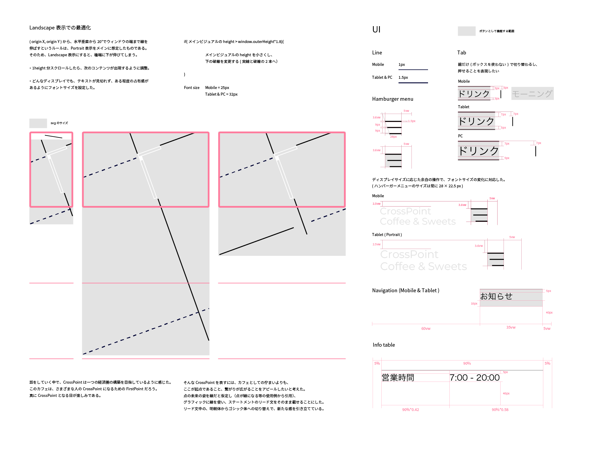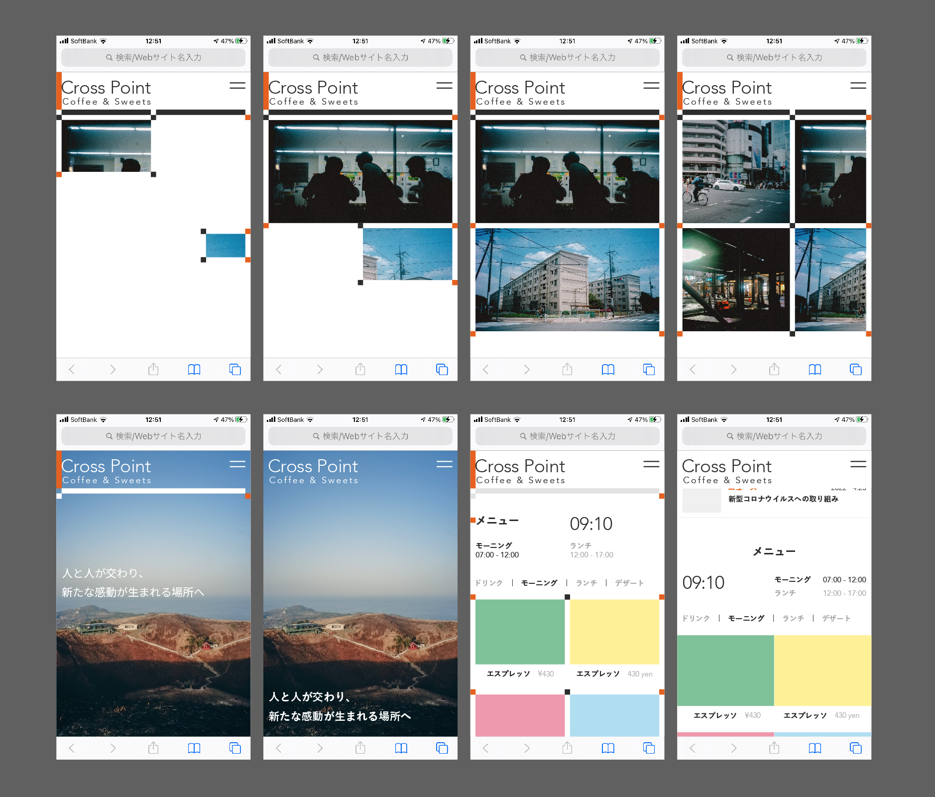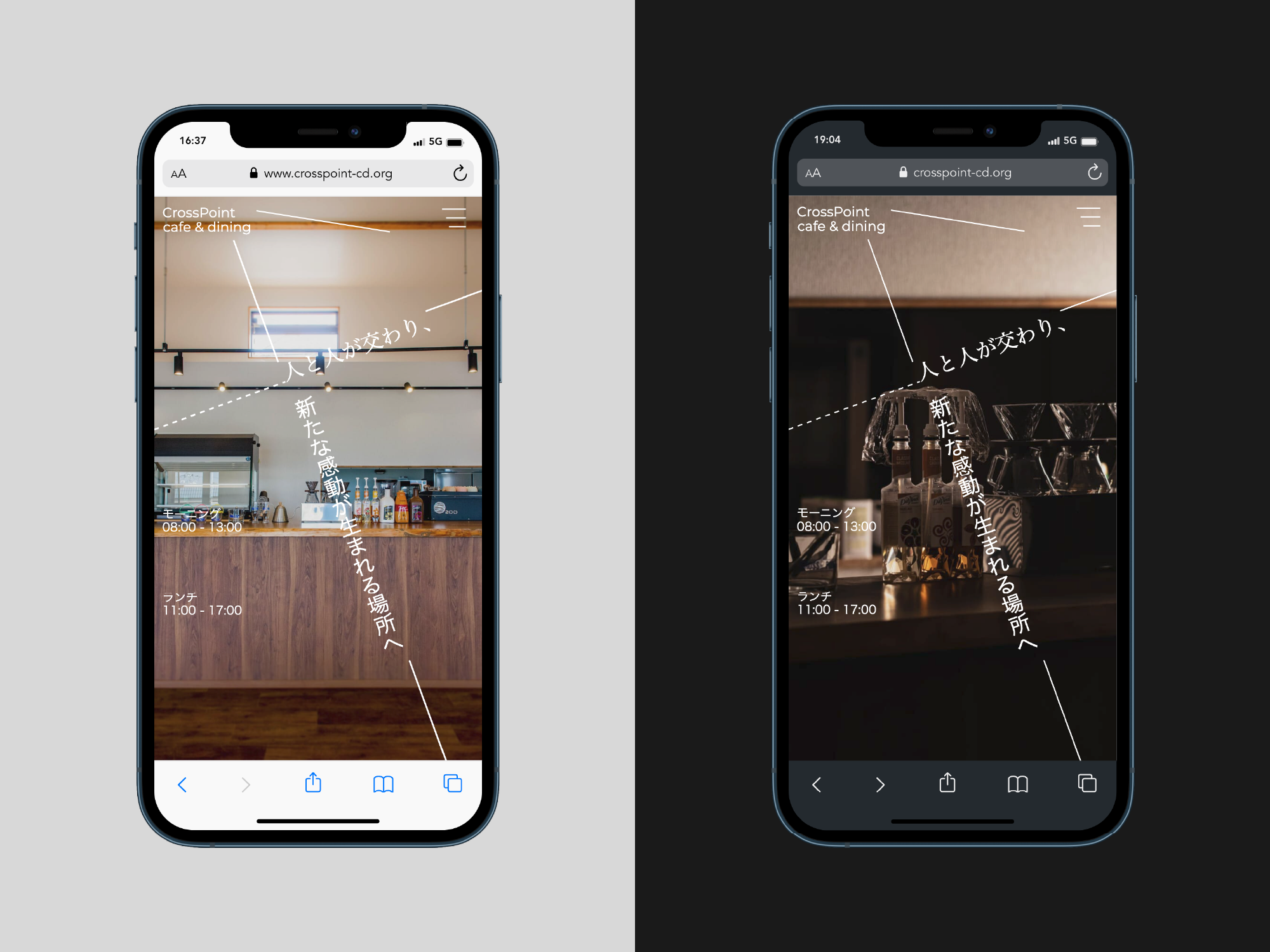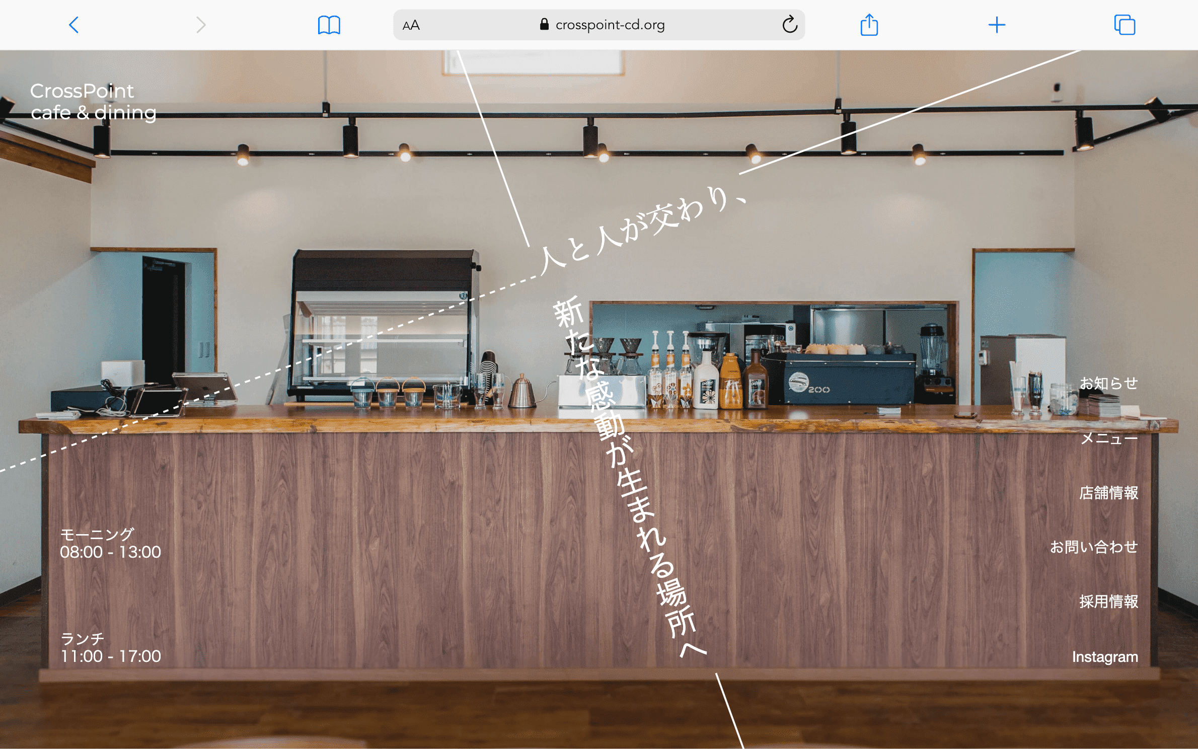 カフェのウェルカムボードを参考に、天気予報APIを使い、気象に応じた文章と写真を表示するほか、時間に合わせてメインビジュアルや、タブのファーストビューを決定する。劣化版SNSを目指すより、同じようだけど日々違うという変化がカフェに合うメディアだと思った。また、ウェブサイトの運用を自分たちで行ってほしいので、スプレッドシートで更新できるようにすることで、サイト運営だけでなく、コンテンツのアーカイブを表で管理することができる。