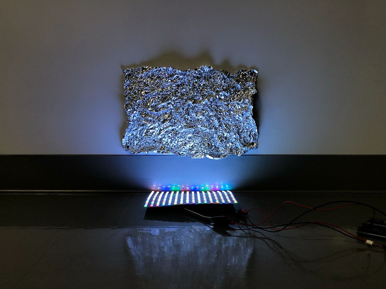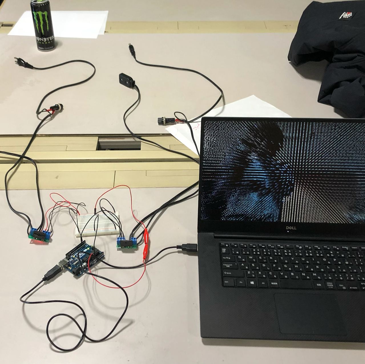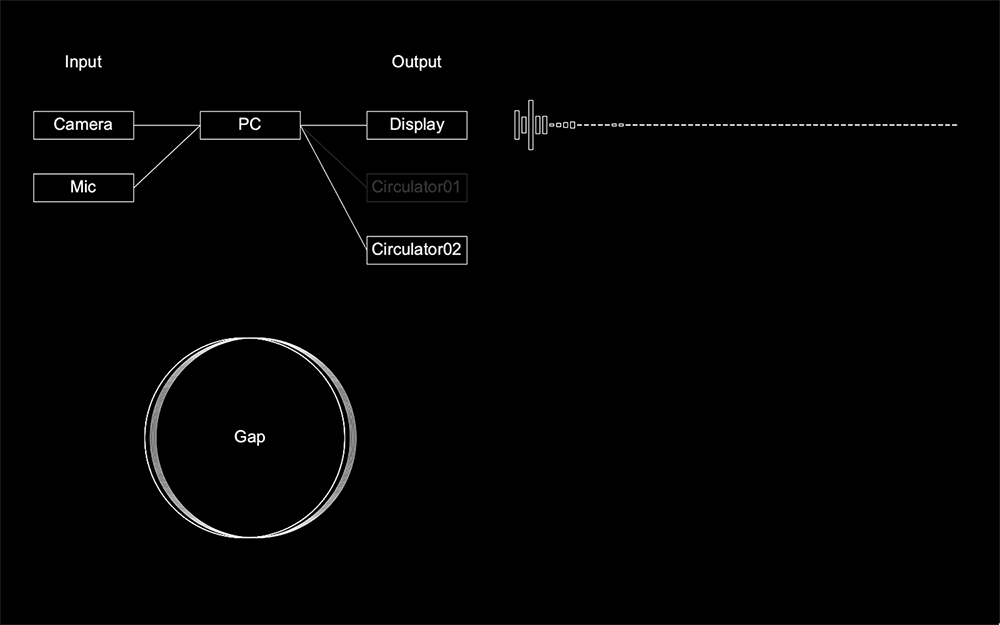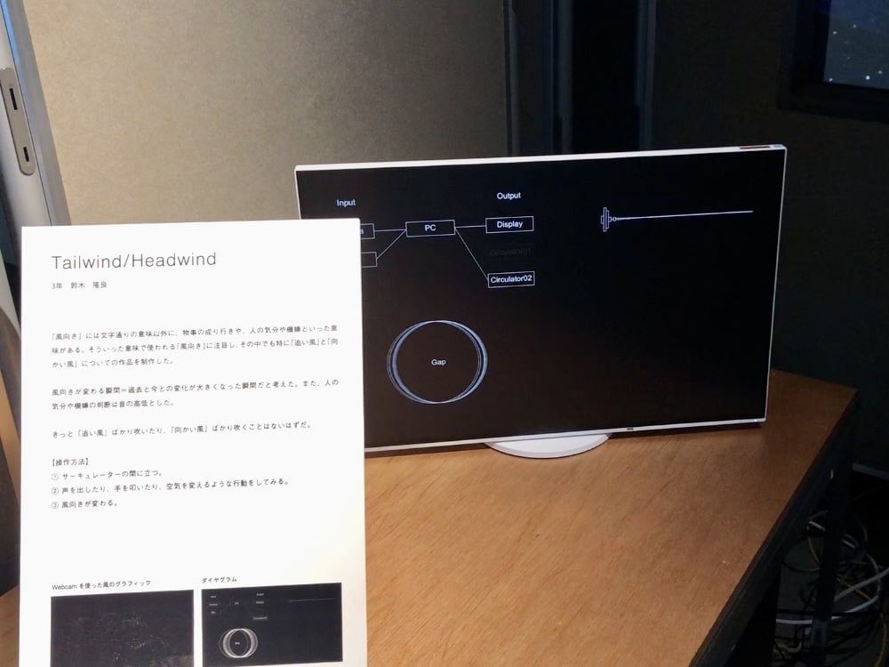 自分自身がこれまで体験してきた追い風、向かい風について考えたとき、どちらとも現状の空気感からの変化が大きくなった際に追い風や向かい風が吹くものだった。ただ空気感は簡単にセンサで読み取ることができない。そこで空気感を他の何かで知る必要があると考えた結果、人やモノが出す音に注目した。急激な音の変化(高低差)があったときに風向きが変わるプログラムとなった。また、風は目で見ることができないので、Webcamを使い、風のグラフィック化を試みた。